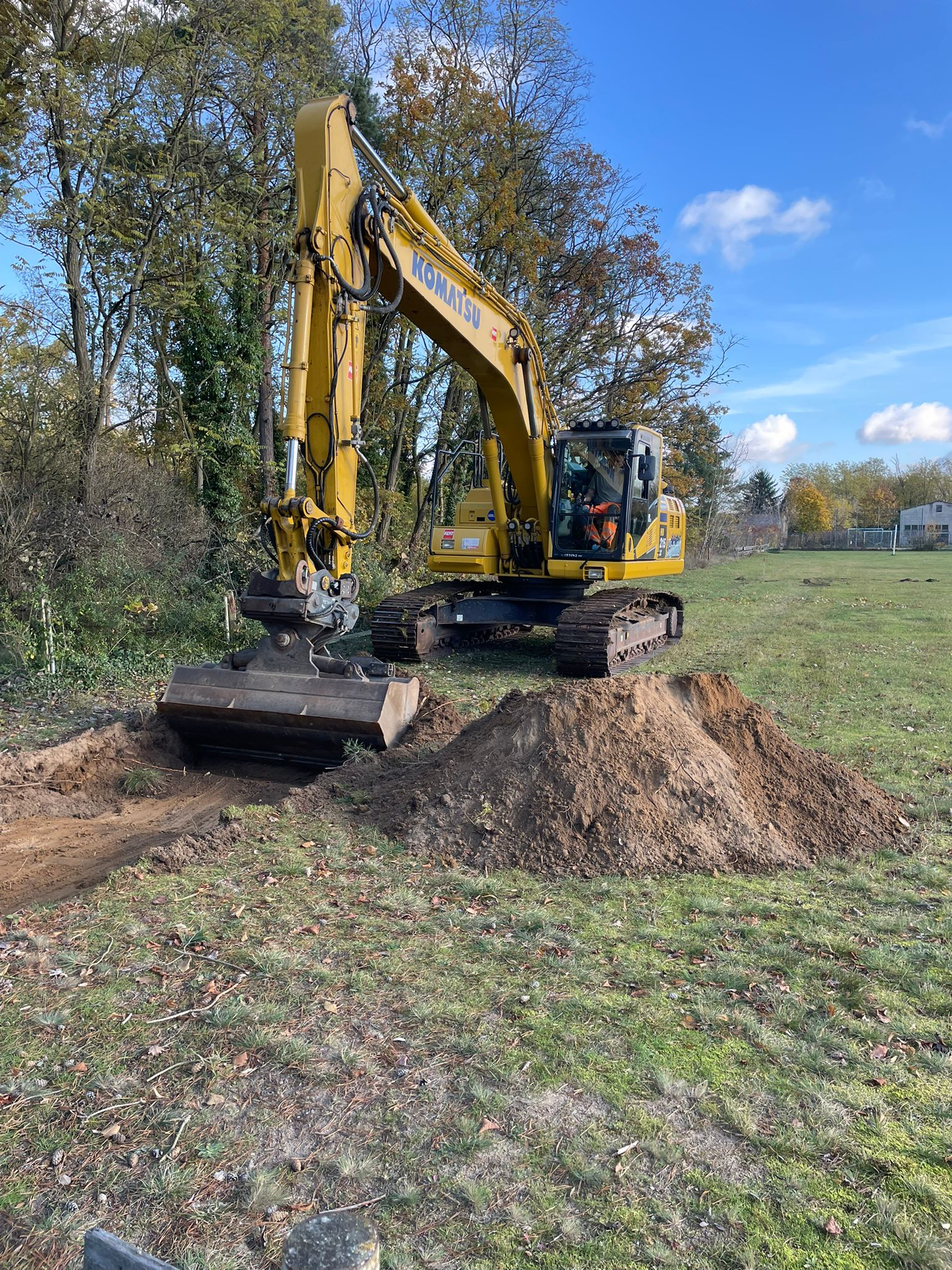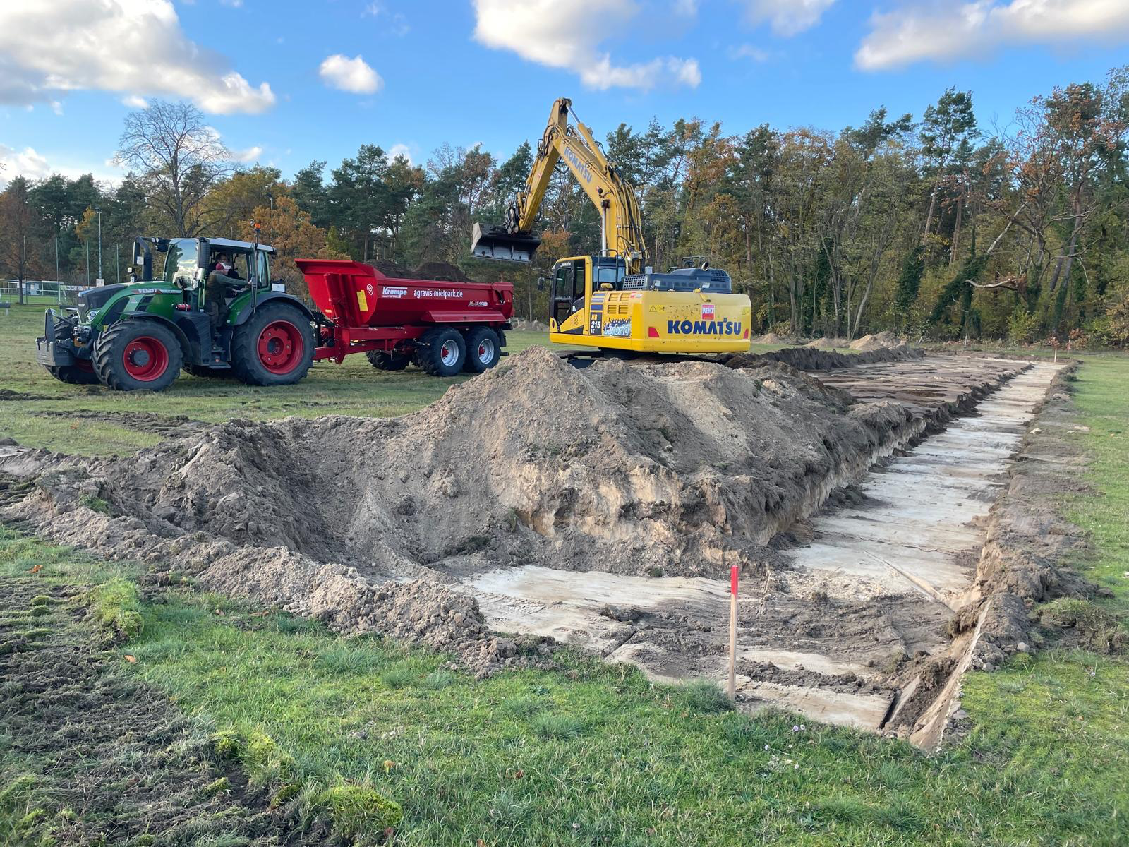 Ein großer Komatsu-Bagger wurde per Tieflader angeliefert und hat direkt mit dem Bodenaushub begonnen. Die erste Reihe ist bereits ausgehoben – ein sichtbares Zeichen dafür, dass unser Projekt nun Fahrt aufnimmt.