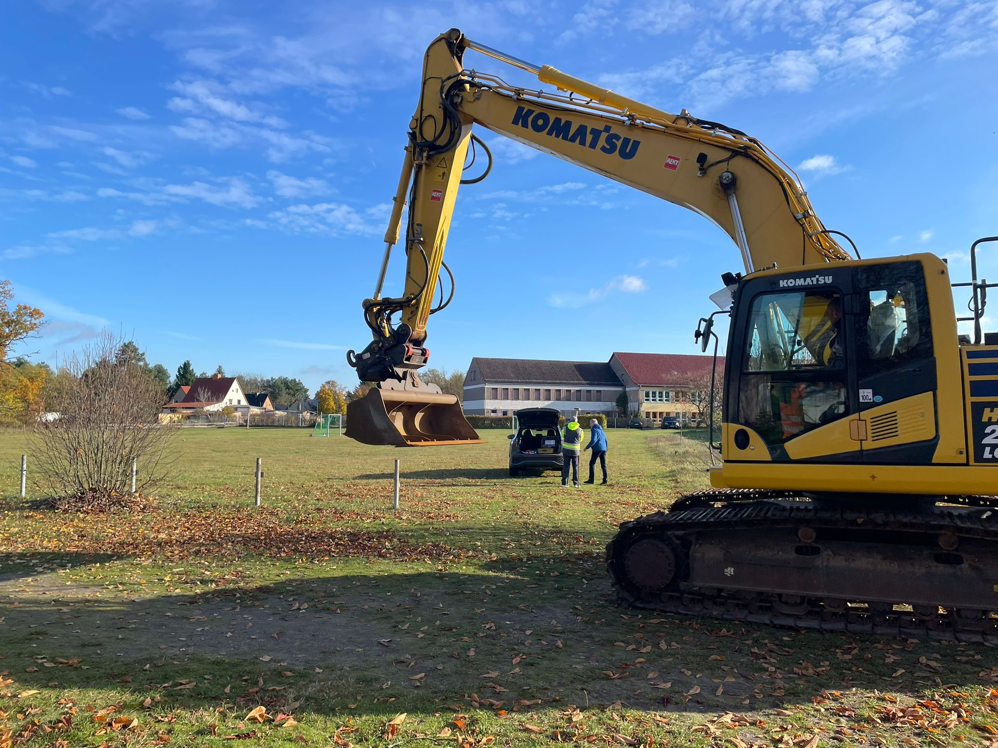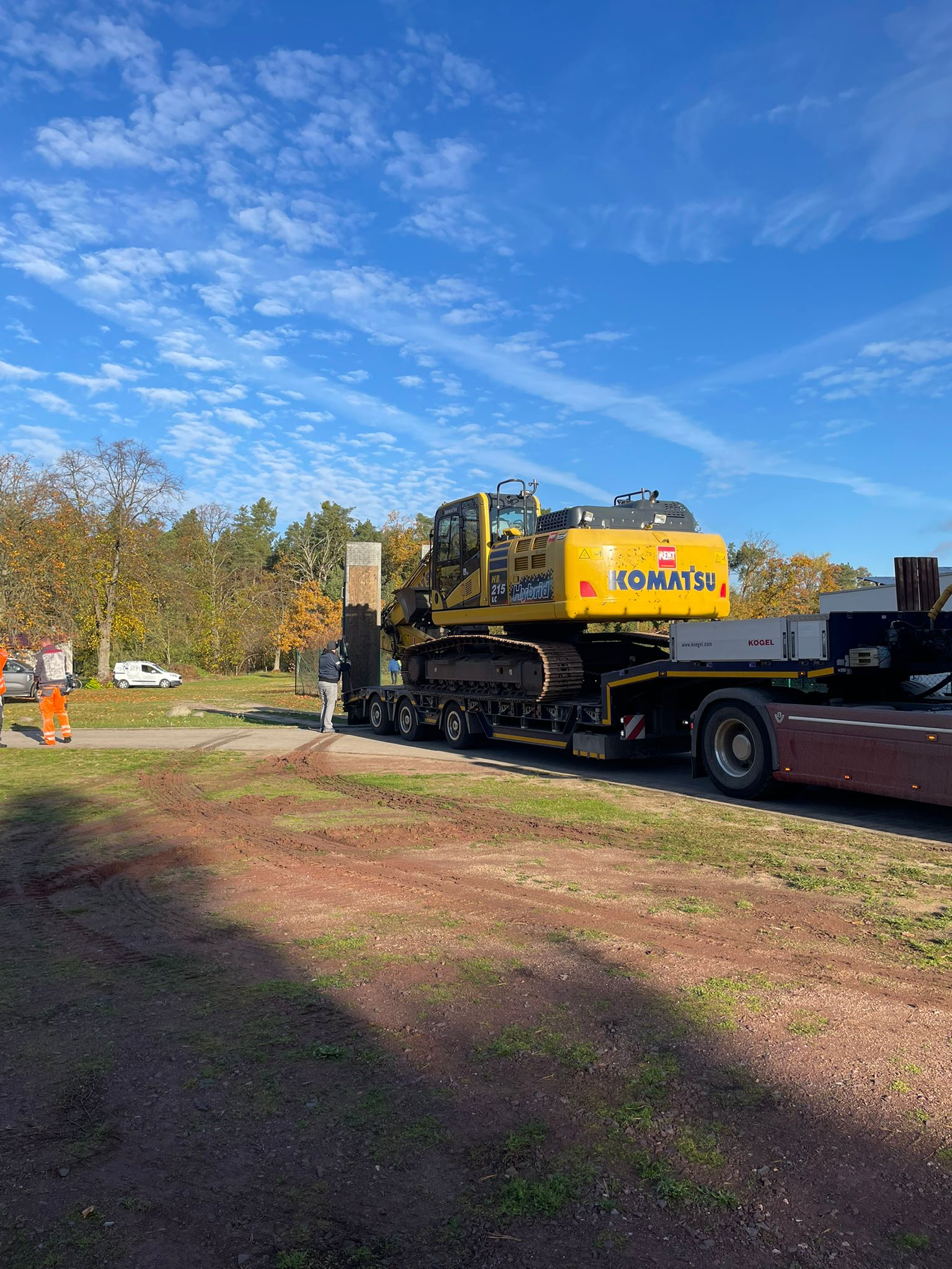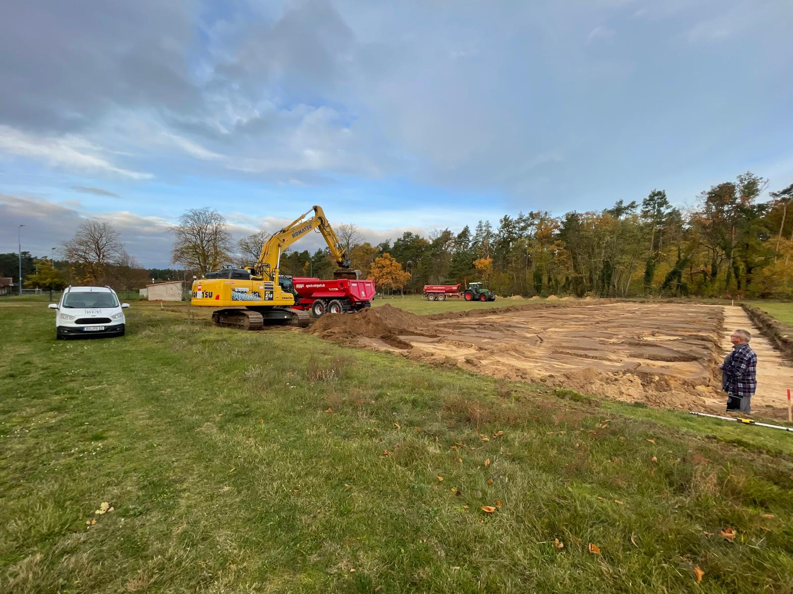 Ein großer Komatsu-Bagger wurde per Tieflader angeliefert und hat direkt mit dem Bodenaushub begonnen. Die erste Reihe ist bereits ausgehoben – ein sichtbares Zeichen dafür, dass unser Projekt nun Fahrt aufnimmt.
